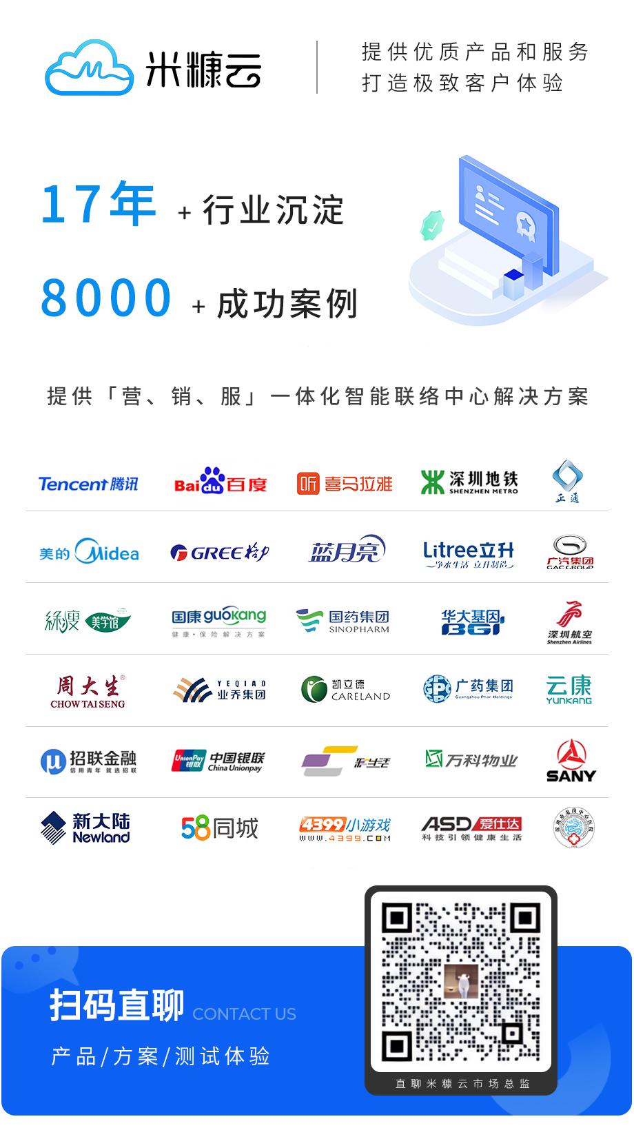 深圳市米糠云科技有限公司是一家專注15年智能通訊服務(wù)商,提供全行業(yè)智能化云通訊解決方案,產(chǎn)品包含:智能呼叫中心、智能語(yǔ)音機(jī)器人、在線客服系統(tǒng)、云通訊(號(hào)碼隱私保護(hù)、一鍵呼叫、語(yǔ)音SDK),已提供呼叫中心系統(tǒng)服務(wù)座席超過(guò)50000+,客戶超過(guò)3000+的呼叫中心系統(tǒng)方案,專業(yè)提供政府、地產(chǎn)、醫(yī)療、保險(xiǎn)、金融、互聯(lián)網(wǎng)、教育等行業(yè)呼叫中心解決方案。