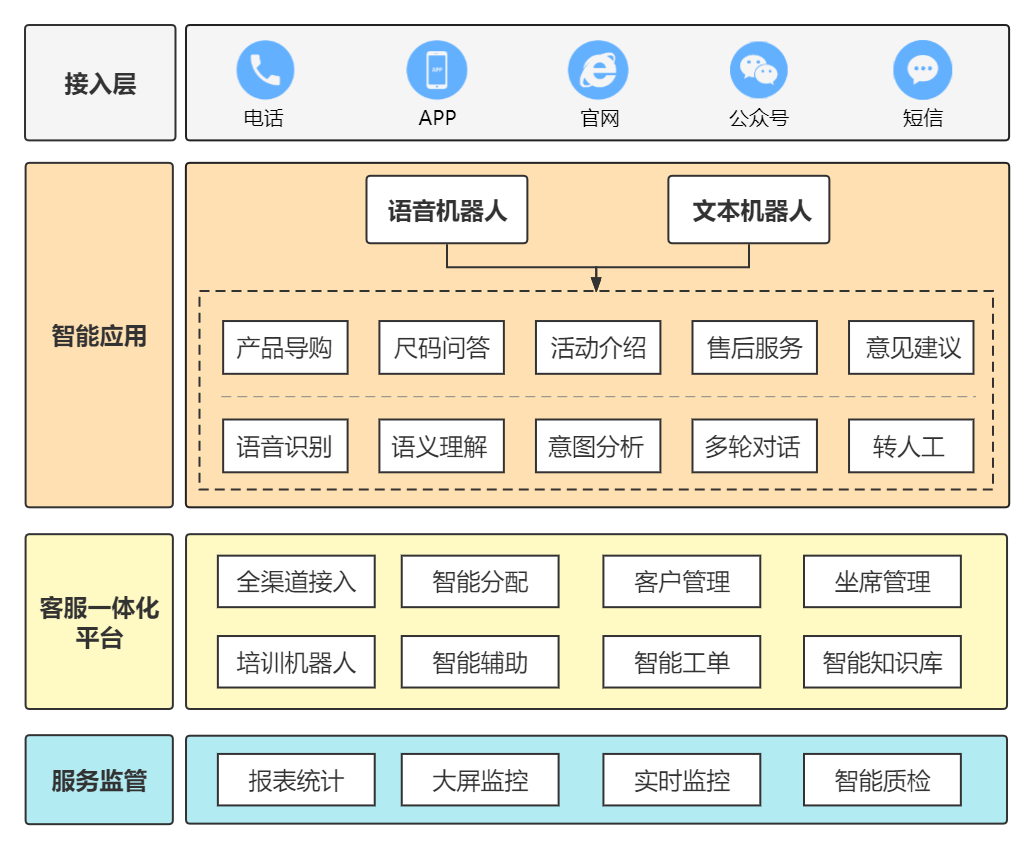 智能客服平臺(tái)融合呼叫中心,打通電話、APP、官網(wǎng)、微信公眾號(hào)等渠道,一站式接收客戶咨詢,輔助傳統(tǒng)客服營(yíng)銷一體化轉(zhuǎn)型。