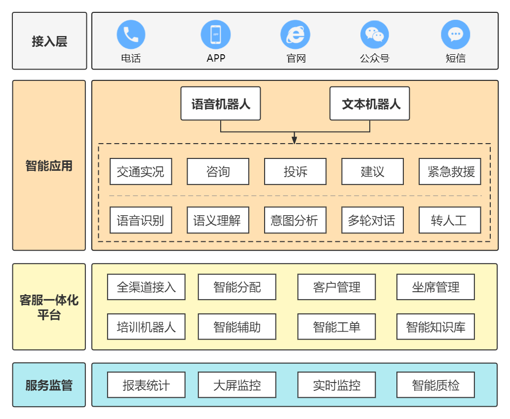 用戶可24小時進(jìn)行交通信息查詢、投訴、建議、咨詢、緊急救援、應(yīng)急救護(hù)等服務(wù),機(jī)器人自動創(chuàng)建并轉(zhuǎn)派工單,還可靈活轉(zhuǎn)接人工,及時響應(yīng)用戶轉(zhuǎn)接人工座席的訴求。